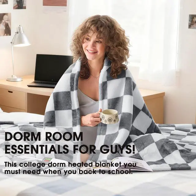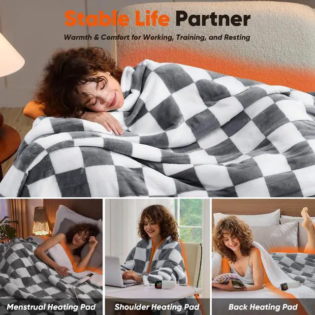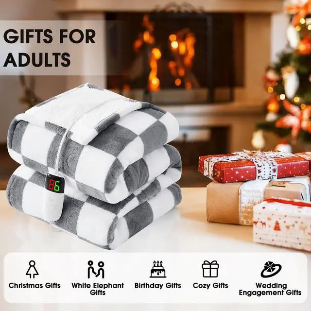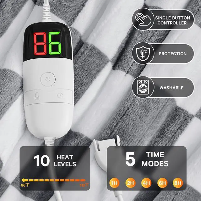 Introducing our premium heated blanket, a perfect blend of style, comfort, and functionality. Measuring 50*60 inches, this electric blanket features a charming checkered pattern in soothing light gray and pure white, making it a tasteful addition to any home decor. Whether you're looking to spruce up your living room couch or add a touch of elegance to your bedroom, this heating blanket throw fits the bill perfectly. When it comes to warmth, our light gray throw blanket stands out from the crowd. Due to its advanced heating technology, it distributes heat evenly across the entire surface with over 85% heat coverage, ensuring that you experience consistent and cozy warmth from corner to corner. If you want to give a gifts for adultswoman or your grandma in winter, Christmas, this heating blanket throw is the right choice for you. For us, safety is paramount. In addition to, this soft blanket features 10 levels of adjustable heat and a four-speed smart auto shut-off (1, 2, 4, 8 hours) that ensures quick and even warmth distribution over more than 85% of the surface area while conserving energy. Our throw blankets for bed are more energy and money efficient than rechargeable and battery operated blankets.The user-friendly single-button controller with large screen makes operation a breeze. Our single-button controllers are also made of heat-resistant materials, making them safe and reliable for use. This blanket warmer is highly versatile. It's not just for keeping warm at home. Its lightweight and portable design make it a great companion for outdoor activities such as camping or picnics during the winter. You can also take it to the office to add some warmth to your workspace. And if you're looking for a unique and thoughtful gift, this bed throw blanket for lap is an excellent option for birthday, holiday, Christmas or housewarming.