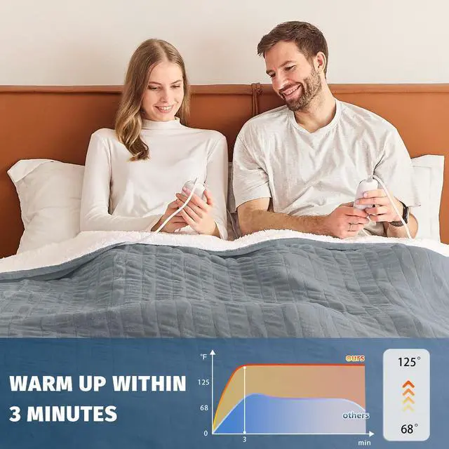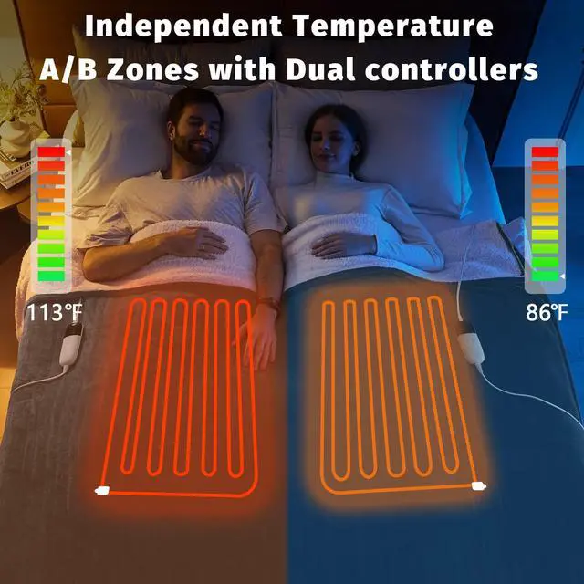 Heated blanket queen/king size is designed with two zones, each with a LED controller, perfectly solving the different requirements in heating & timing,no more battle for thermally compatible couples.
