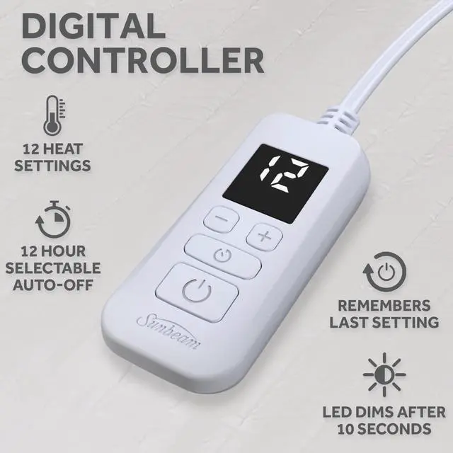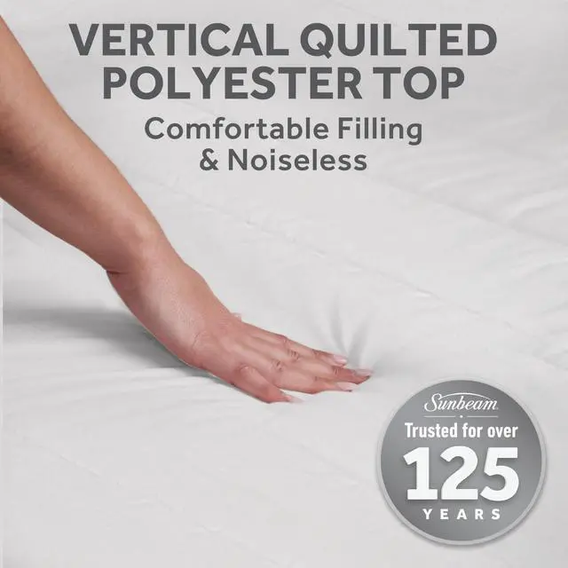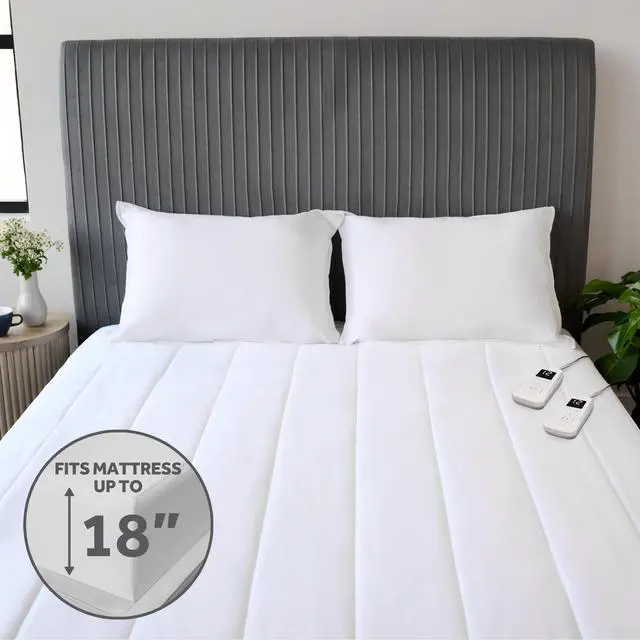 Restful Quilted Electric Heated Mattress Pad surrounds your bed in cozy, soothing warmth for restful sleep on chilly nights. The extra-soft vertical quilted top adds plush comfort while providing consistent heat throughout the night. Sized for Queen beds (80" x 60"), the built-in skirt stretches to fit mattresses up to 18" deep, ensuring a secure fit that stays in place. Customize your comfort with the easy-to-use digital controller, offering 12 personalized heat settings to help you find your perfect warmth. The LED display dims for nighttime convenience, and the controller remembers your last heat setting. For added peace of mind, the pad features a 12-hour selectable auto shut-off and built-in overheat protection. Premium heated wires sense and adjust for consistent, even warmth all night long. When its time to clean, simply detach the controller and toss the mattress pad in the washing machine. Its dryer-safe and stays soft wash after wash. heated beddingproviding cozy, restful sleep and trusted American comfort for over 125 years.