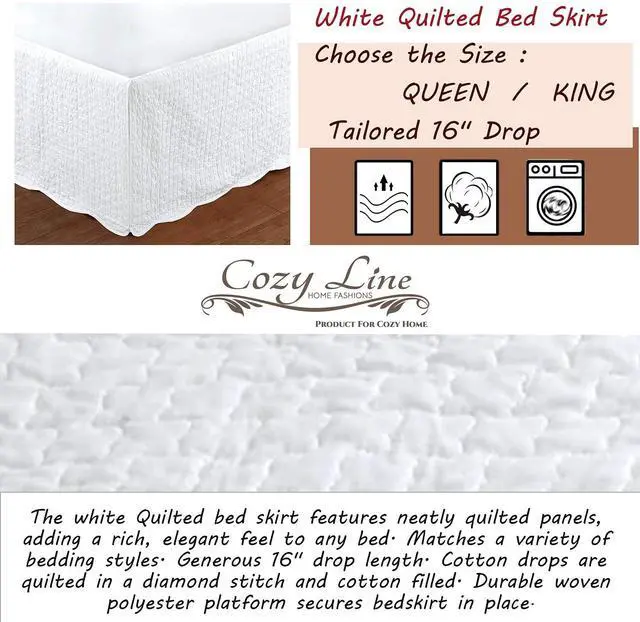 The white Quilted bed skirt features neatly quilted panels, adding a rich, elegant feel to any bed. Matches a variety of bedding styles. Generous 16" drop length. Cotton drops are quilted in a diamond stitch and cotton filled. Durable woven polyester platform secures bedskirt in place.