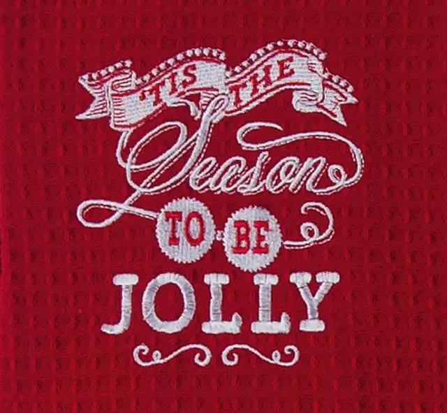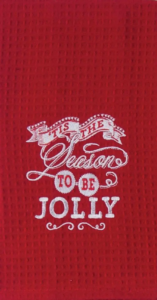 This waffle weave dish towel features a cute "tis the season to be jolly" design so that you can decorate your kitchen with festive holiday charm this winter.. Measures 28 x 18 inches. Made of 100% waffle weave cotton, embroidered design. Made by Kay Dee