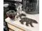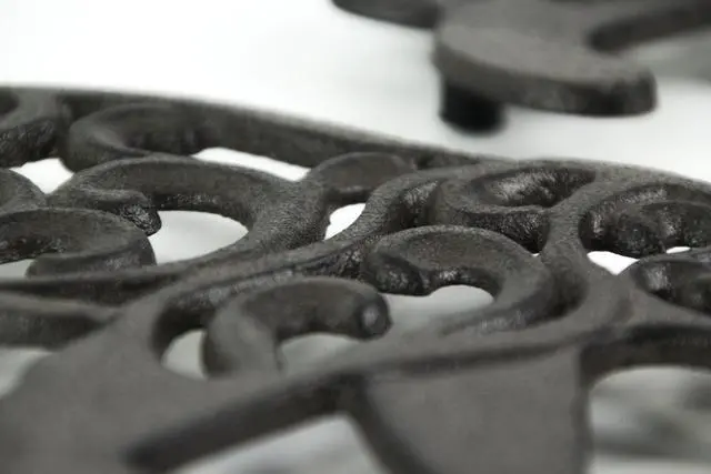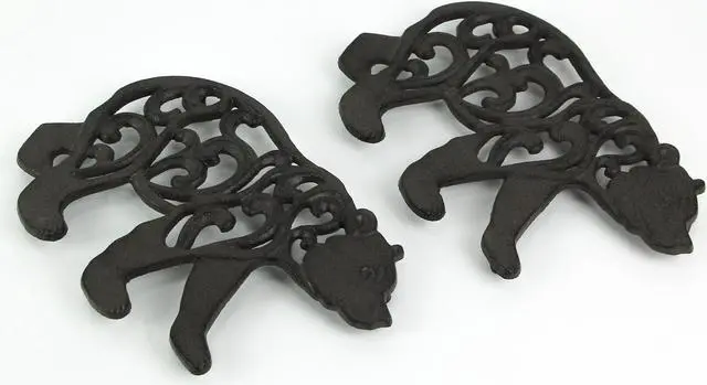 This two-piece set of black bear-shaped cast iron trivets is a fun addition to any country or lodge-style kitchen. The trivets feature an openwork design in black enamel with, a lightly distressed finish. Both fun and functional, these trivets can double as a wall or shelf decorative accents when not protecting your table or counters from hot pans The rubber-tipped feet help protect surfaces from scratches while giving grip to prevent sliding around. Each trivet measures 9 inches long, 6 inches wide, and 0.5 inches high. They are a wonderful rustic accent for your home, and also make a great gift.