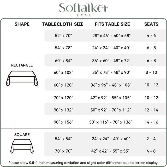 Measurement: This rectangular table cloths are available in 10 sizes: 52"x70", 54"x54", 54"x78", 60"x84", 60"x102", 60"x120", 70"x70", 70"x120", 90"x132", 90"x156", please measure your table size and according to the size guiding chart before purchasing.
