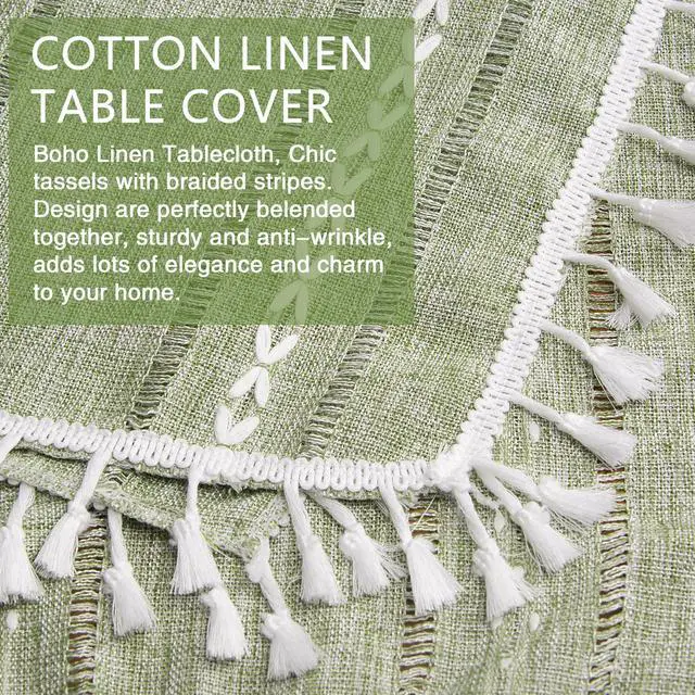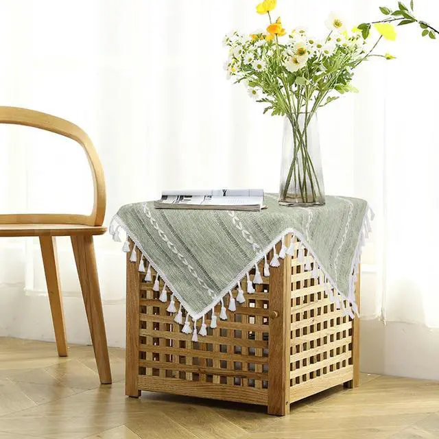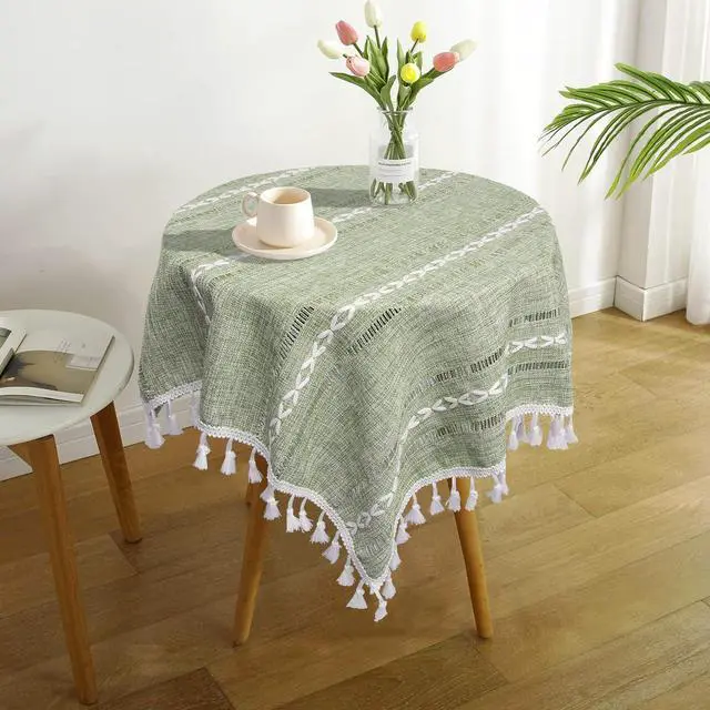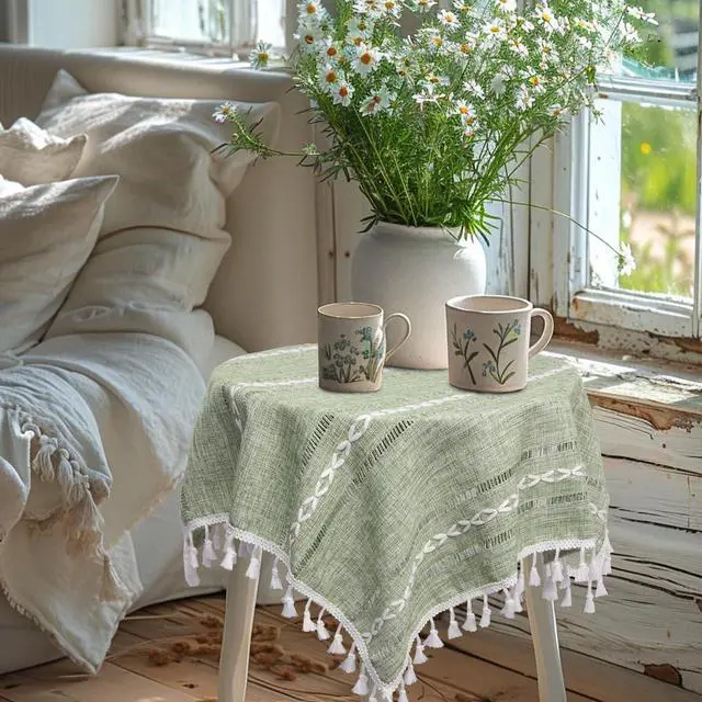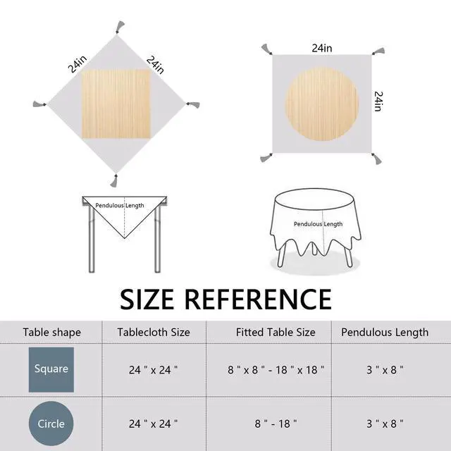 The small farmhouse table cloth size is 24x24 inch with tassels, bedside table cloth, end table runner, nightstand tablecloth, small round table cover. It is recommended that the size of the table is 8-18 inches.