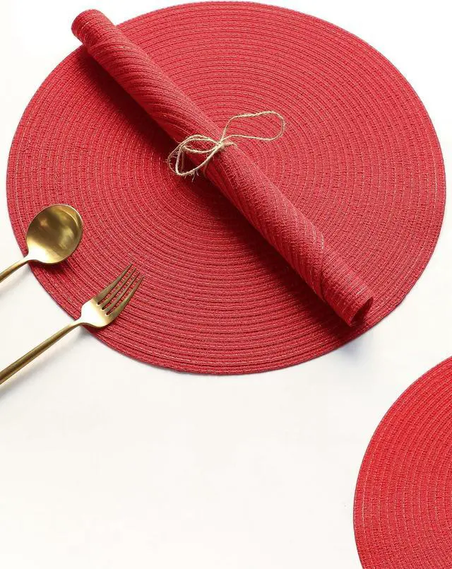 Tanvia 6 Pack 15 Inch Round Braided Placemats, Washable Heat Resistant Cotton Polyester Circle Place Mats for Kitchen Dining Table, Red