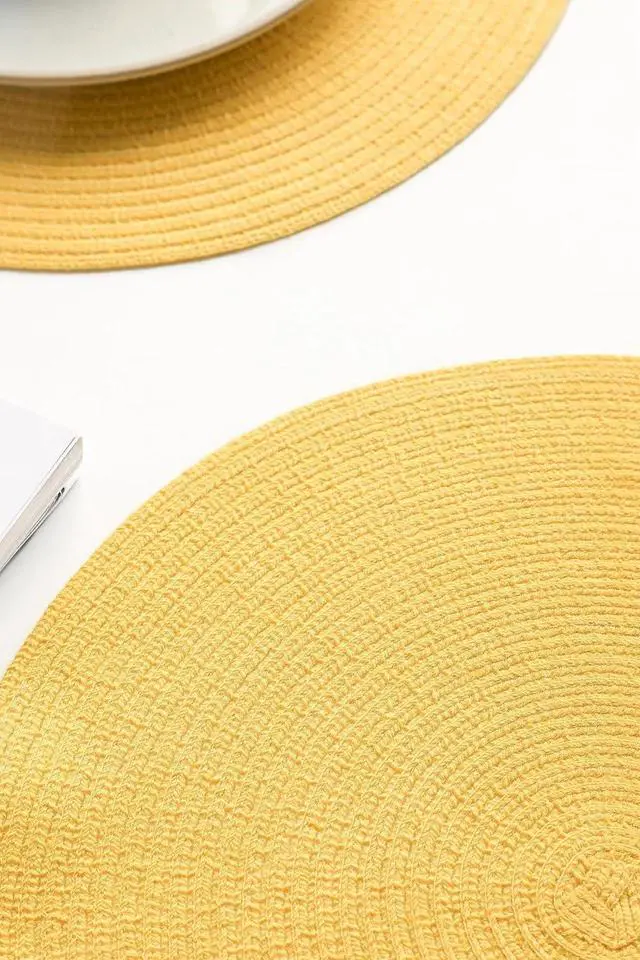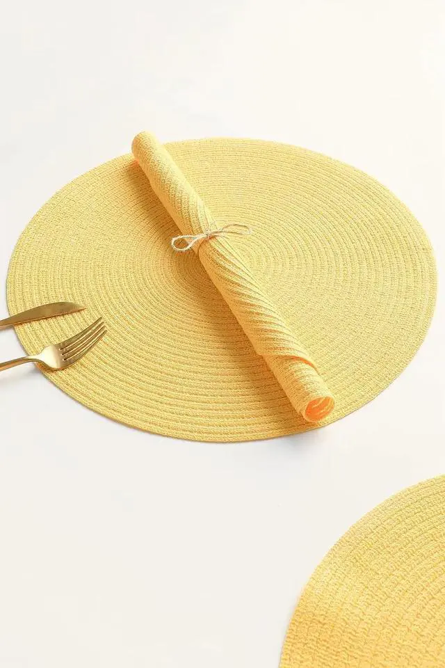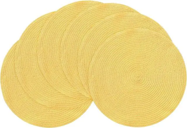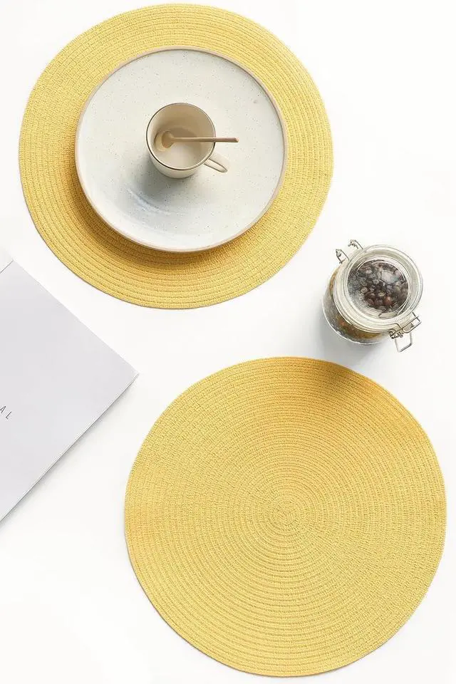 Tanvia 4 Pack 15 Inch Round Braided Placemats, Washable Heat Resistant Cotton Polyester Circle Place Mats for Kitchen Dining Table, Yellow