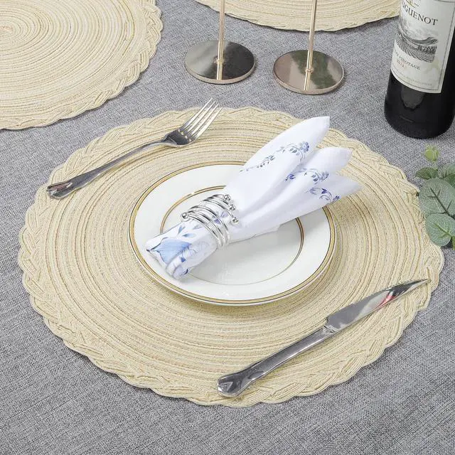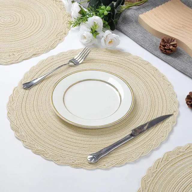 Tanvia 4 Pack Round Braided Placemats with Woven Lace Edge, 15 Inch Farmhouse Style Placemat for Table Decor, Heat Resistant Durable Table Mats, Beige