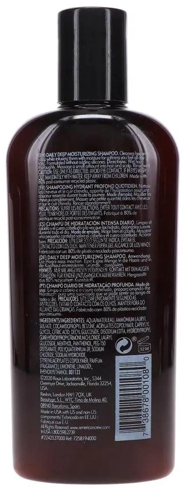 American Crew Daily Deep Moisturizing Shampoo 8.4O unce 450 Milliliters With improved moisturizing and softening properties, American Crew Daily Deep Moisturising Shampoo revitalizes and cleanses your scalp and hair and provides moisture balance. This improved moisturizing shampoo conditions your hair without causing build-up and is perfect for all hair types. Enriched with Quillaja, rosemary, and thyme extracts, this shampoo promotes healthy scalp and hair growth. Boasting an excellent combination of three types of surfactants, this shampoo features the best properties of gentleness and cleansing.