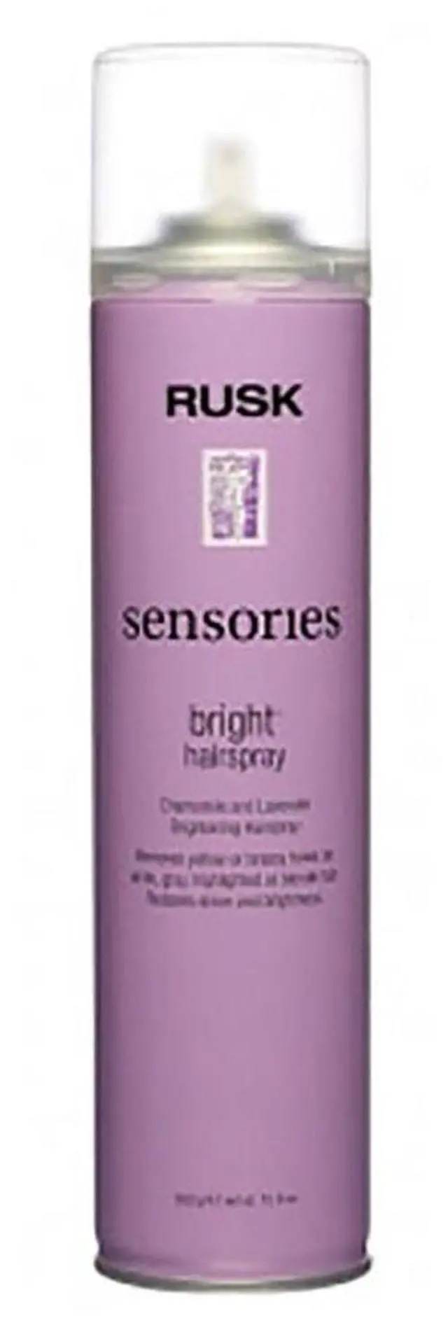 Particularly formulated with color-enhancing chamomile and lavender, Rusk Sensories Bright Hairspray is a fast-drying formula providing a strong, touchable, non-sticky hold. It is ideal for neutralizing unnecessary yellow tones on dull, lifeless silver, gray or white hair. This hairspray includes Vitamin E that protects, repairs and conditions the hair internally and externally. In addition, its protective moisture and UV barriers control frizz, make available humidity resistance, and help protect color from fading.