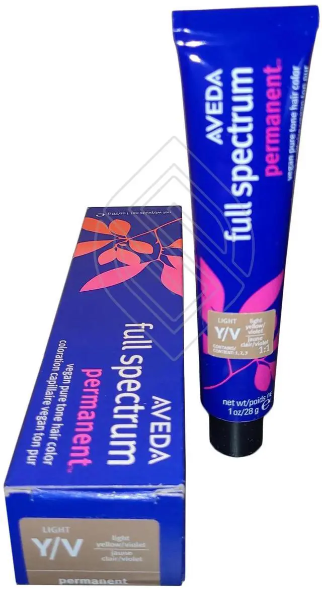 Aveda Full Spectrum Permanent Pure Tone Hair Color 1oz Light Y/V Yellow/Violet. An up to 96% naturally derived formula, which delivers outstanding fade-resistant color. Organic sunflower, castor, and jojoba oils infuse the hair with incredible shine and condition.