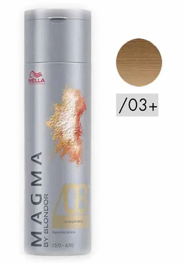 Wella Magma /03 By Blondor 2/0-5/0 Natural Gold Intense 4 Ounce 120 Milliliters Wella Magma by Blondor is a permanent hair color system that lightens up to 6 shades and tones in one step. There is a total of 16 inter-mixable shades for maximum creativity. Its portfolio of inter-mixable shades can create a variety of soft delicate, and vibrant results. Magma By Blondor can be used with all Wella Developers 1, 9 % up to 12 % depending on the level of lift and tone intensity needed.