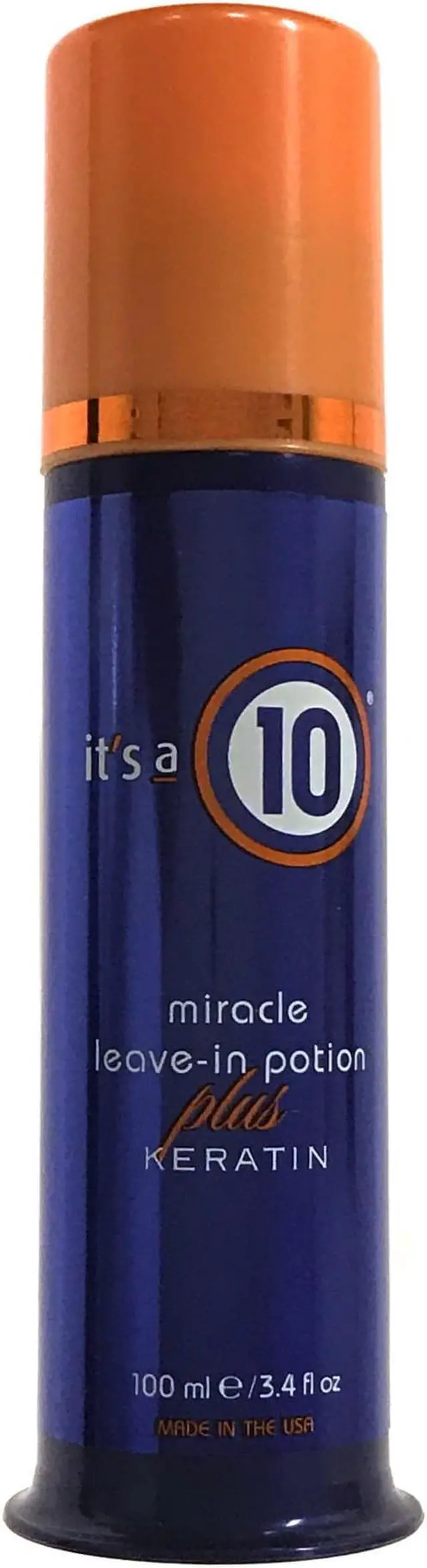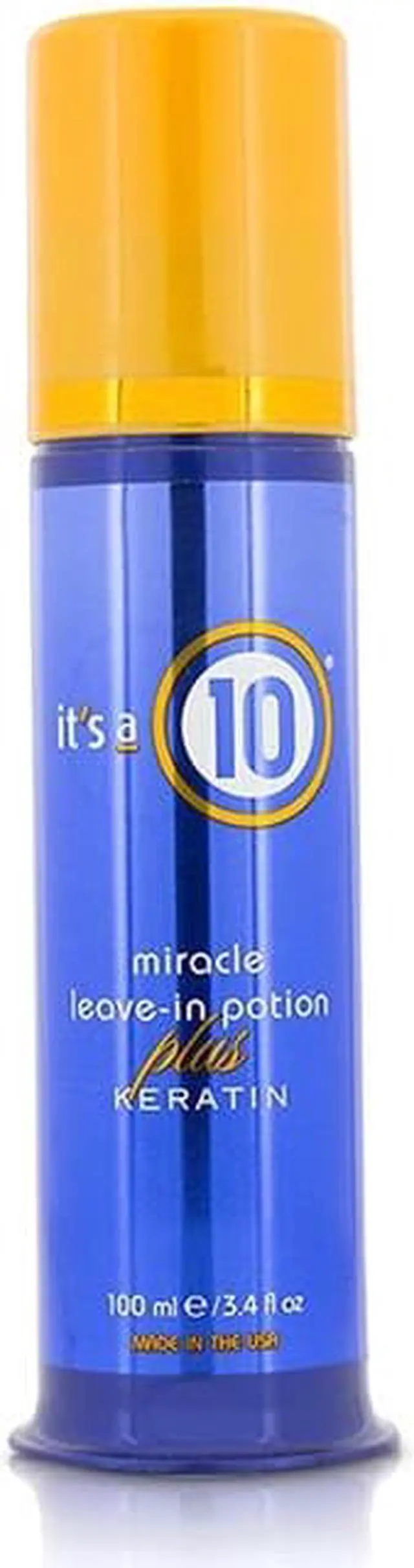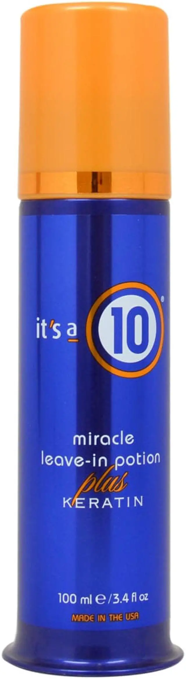 Miracle leave-in potion plus keratin infuses hair with silky softness while eliminating frizz or the appearance of damage. Does 10 things instantly. Humidity resistant. Blow dryer and flat iron use.
