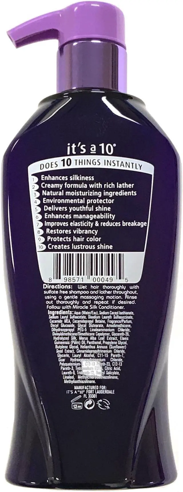Its a 10 Miracle Silk Shampoo enhances silkiness, creamy formula with rich lather, natural moisturizing ingredients, environmental protector, delivers youthful shine, enhances manageability, improves elasticity andamp; reduces breakage, restores vibrancy, protects hair color andamp; creates lustrous shine.