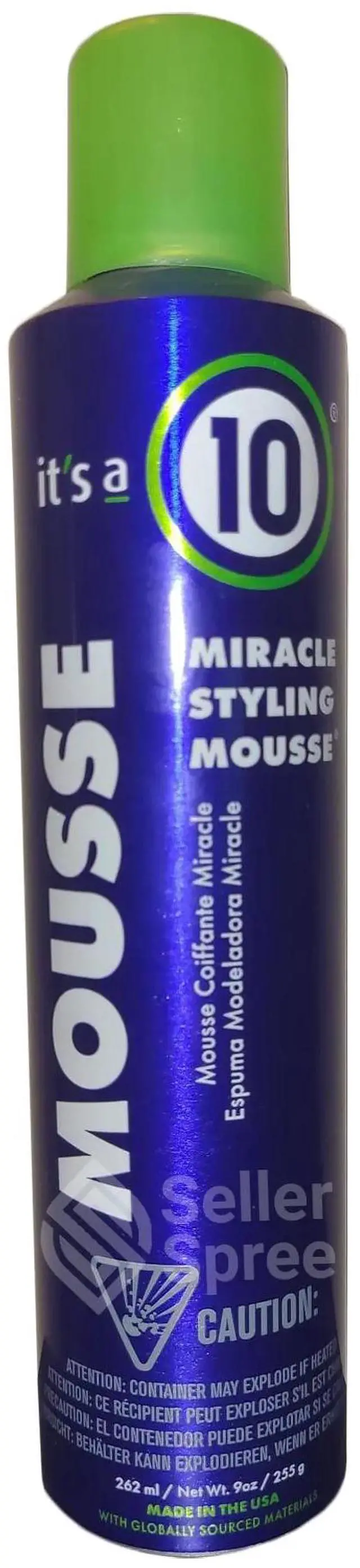It's A 10 Miracle Styling Mousse 9oz 262ml helps nourish and strengthen hair with a nutrient rich, workable formula. Use It's a 10 Haircare's Miracle Styling Mousse to achieve the volume, texture and hold you want without the crunch. Satisfy your beauty sweet spot with this decadent, nutrient filled styling aid that adds shine, texture and lift while strengthening your hair. Looking to lock your waves? The Miracle Styling Mousse helps define curls with a superior hold.