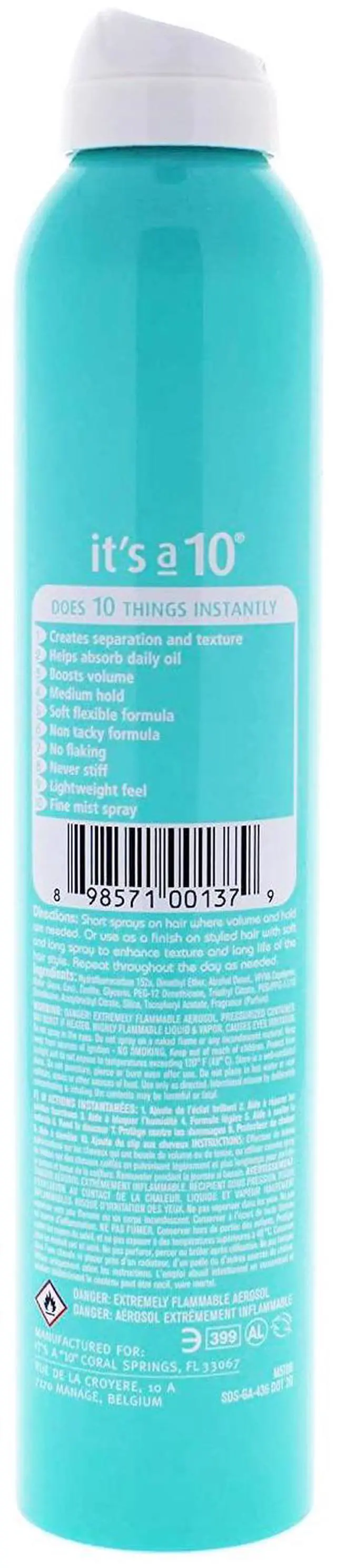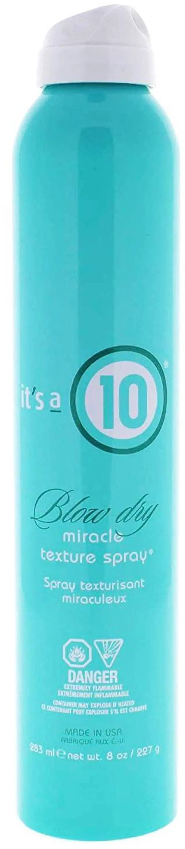 If you love sleek or detailed styles, crave natural-looking volume, or if you need dependable hold thats never sticky or crunchy, then Its a 10 Miracle Blow Dry Texture Spray is just for you. Created as a smart alternative to traditional hair spray, this light-as-air formula provides just the right amount of flexible hold with zero tacky feel. The fine mist works to enhance separation and texture strand by strand, so that there are never any flakes or stiffness, just beautiful style that lasts and lasts.