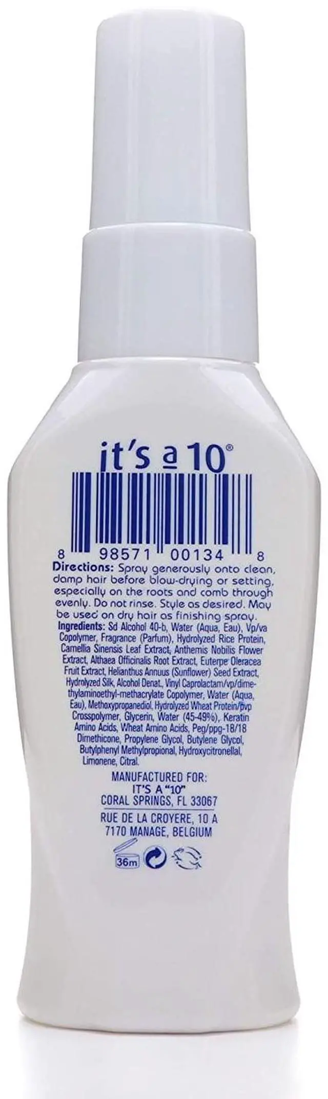 For instant body with no fuss, It's a 10 Miracle Volumizing Blowdry Spray's advanced formula will give your hair a gorgeous look and bounce without weighing it down. The Volumizing Blowdry Spray can dramatically decrease blow drying time while providing a healthy coat of protection against heat that can otherwise damage and break hair. Designed as a lightweight formula, this spray will help detangle and smooth your lovely locks, eliminate frizz and protect against humidity with long-lasting results.