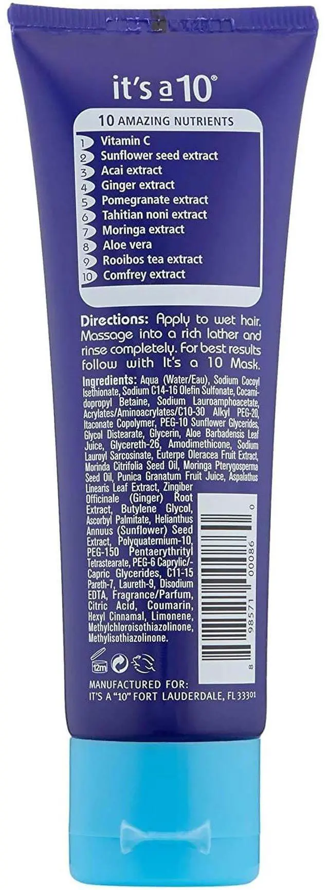 It's A 10 Miracle Moisture Shampoo 2oz 60ml protects and strengthens hair with every shampoo. Effective and intensely hydrating, with a cleansing formula gentle enough to use safely on even the most delicate color-treated hair. The Miracle Moisture Shampoo takes the guesswork out of finding the right shampoo. From the first wash, hair is softer, less damaged, and is visibly more bouncy and full of body. With repeated daily use, hair reflects the natural shine of healthy hair that everyone desires. Apply to wet hair, Massage into a rich lather and rinse completely.