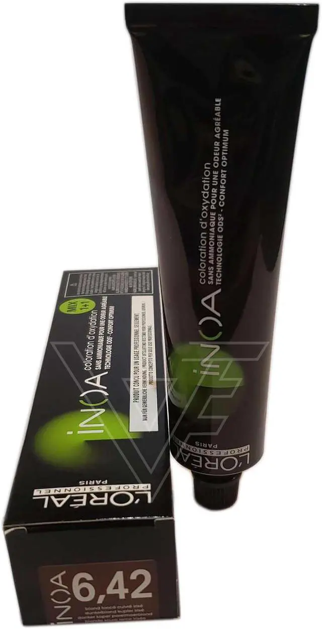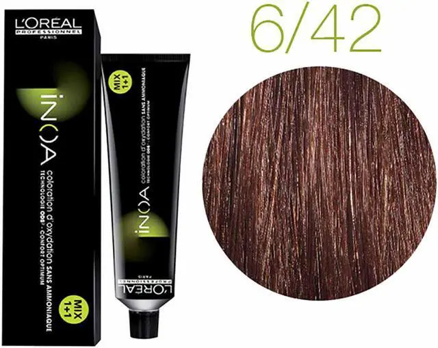 Loreal Inoa Hair Color 6.42 (European Package For 6.42 /6CV)Deep Copper Blonde ODS2 No Ammonia 2 permanent color with ODS2 technology with uncompromised comfort. Lightens up to 3 levels in 35 minutes. Covers up to 100% of white hair. Loreal Inoa hair color contains no ammonia and enriched with oils and delivers outstanding color to the heart of the hair. INOA leaves hair feeling conditioned with sublime color radiance until your next color appointment. Experience our ultimate in luxury color, with improved comfort during the development time and no odor. These color tubes are imported from Europe and display in the European System of shade numbers.