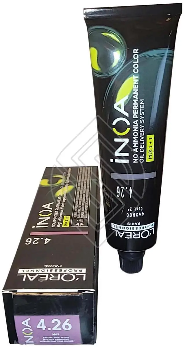 Loreal Inoa Ammonia Free ODS2 Hair Color 60g/2oz # 4.26 (Original- 4.26 /4VR) permanent color with ODS2 technology with uncompromised comfort. Lightens up to 3 levels in 35 minutes. Covers up to 100% of white hair. Loreal Inoa hair color contains no ammonia and is enriched with oils and delivers outstanding color to the heart of the hair. INOA leaves hair feeling conditioned with sublime color radiance until your next color appointment. Experience our ultimate in luxury color, with improved comfort during the development time and no odor.