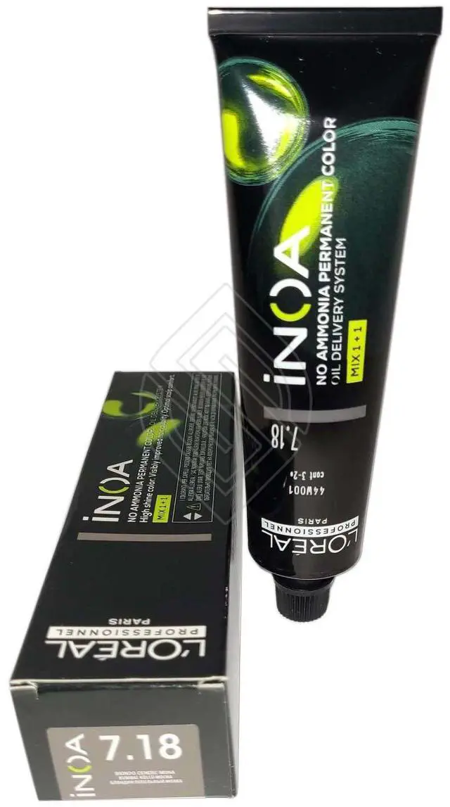 Loreal Inoa Hair Color # 7.18 (Originally- 7.18 /7BM)Ash Mocha Blonde No Ammonia permanent color with ODS2 technology with uncompromised comfort. Lightens up to 3 levels in 35 minutes. Covers up to 100% of white hair. Loreal Inoa hair color contains no ammonia and is enriched with oils and delivers outstanding color to the heart of the hair. INOA leaves hair feeling conditioned with sublime color radiance until your next color appointment. Experience our ultimate in luxury color, with improved comfort during the development time and no odor.