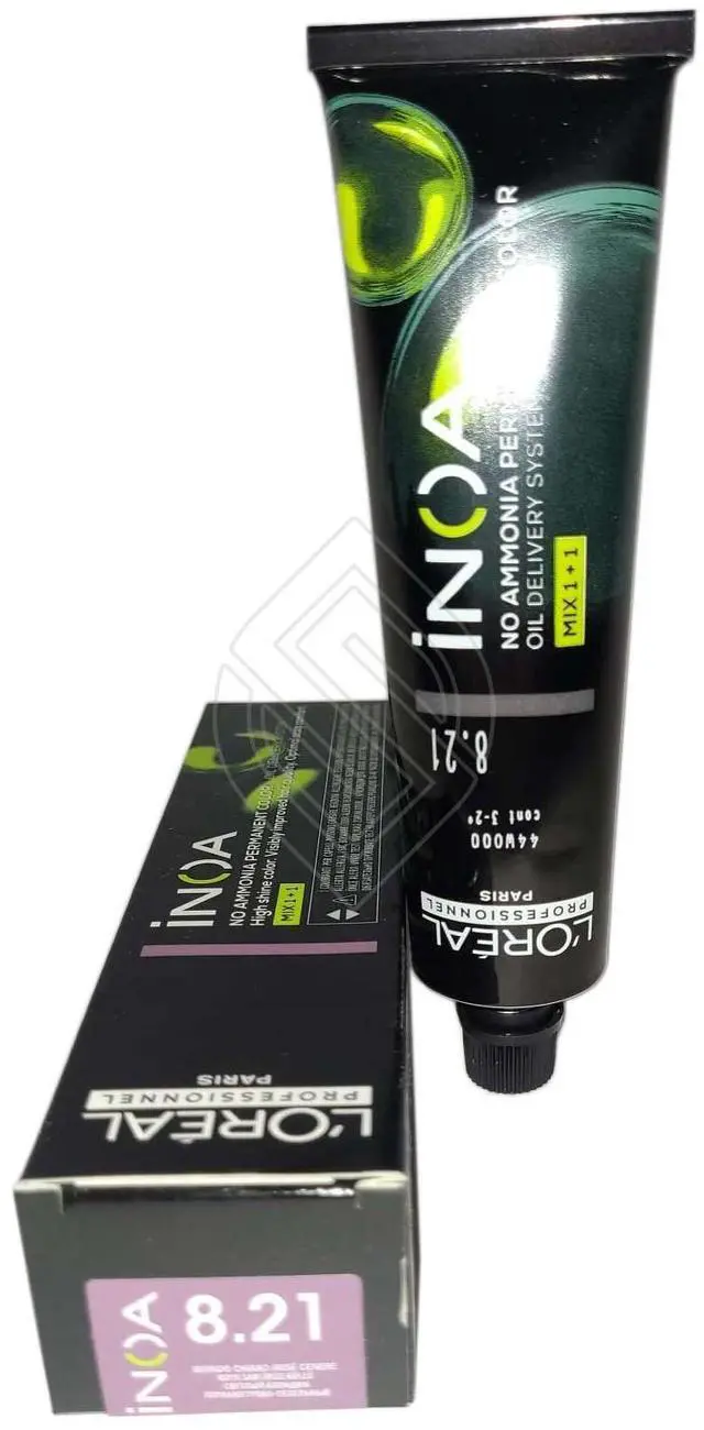 Loreal Inoa Hair Color # 8.21 (Originally- 8.21 /8VB) Light Blonde Iridescent Ash ODS2 No Ammonia 2 permanent color with ODS2 technology with uncompromised comfort. Lightens up to 3 levels in 35 minutes. Covers up to 100% of white hair. Loreal Inoa hair color contains no ammonia and is enriched with oils and delivers outstanding color to the heart of the hair. INOA leaves hair feeling conditioned with sublime color radiance until your next color appointment. Experience our ultimate in luxury color, with improved comfort during the development time and no odor.