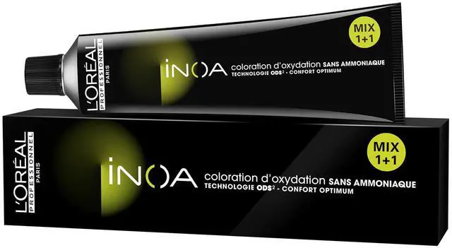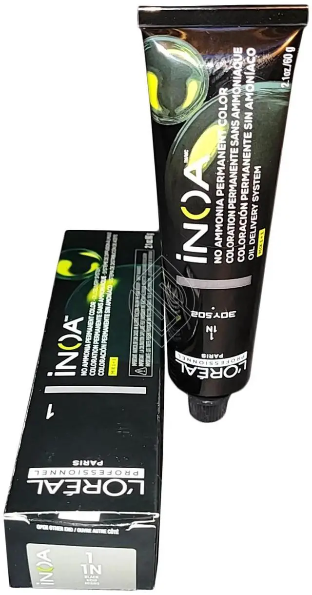 LOreal Professionnel INOA Ammonia Free Hair Color 2.1 oz (1/1N) Black Permanent color with ODS2 technology for uncompromised comfort. Lightens up to 3 levels in 35 minutes. Covers up to 100% of white hair. Easy to mix and apply. Leaves hair feeling intensely nourished and hydrated until next color treatment. Hair is softer than before the hair coloring process. Sublime shine. Mix 1 to 1 ratio. Contains no ammonia and no odor.
