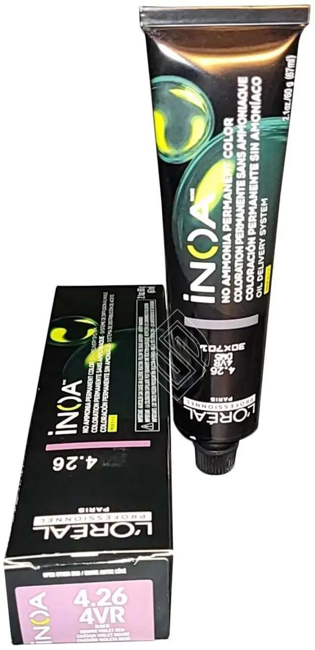 LOreal Professionnel INOA Ammonia Free Hair Color 2.1 oz ( 4.26 /4VR) Iridescent Red Brown No ammonia permanent color with ODS2 technology for uncompromised comfort. Lightens up to 3 levels in 35 minutes. Covers up to 100% of white hair. Easy to mix and apply. Leaves hair feeling intensely nourished and hydrated untill next color treatment. Hair is softer than before hair coloring process. Sublime shine. Mix 1 to 1 ratio.