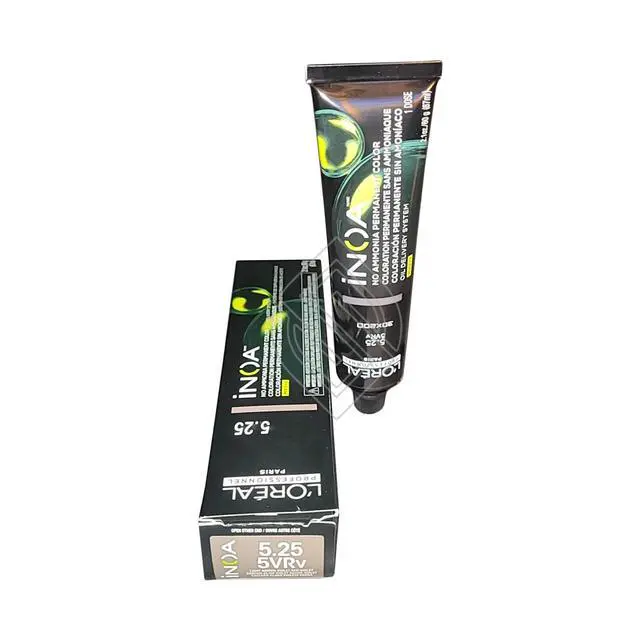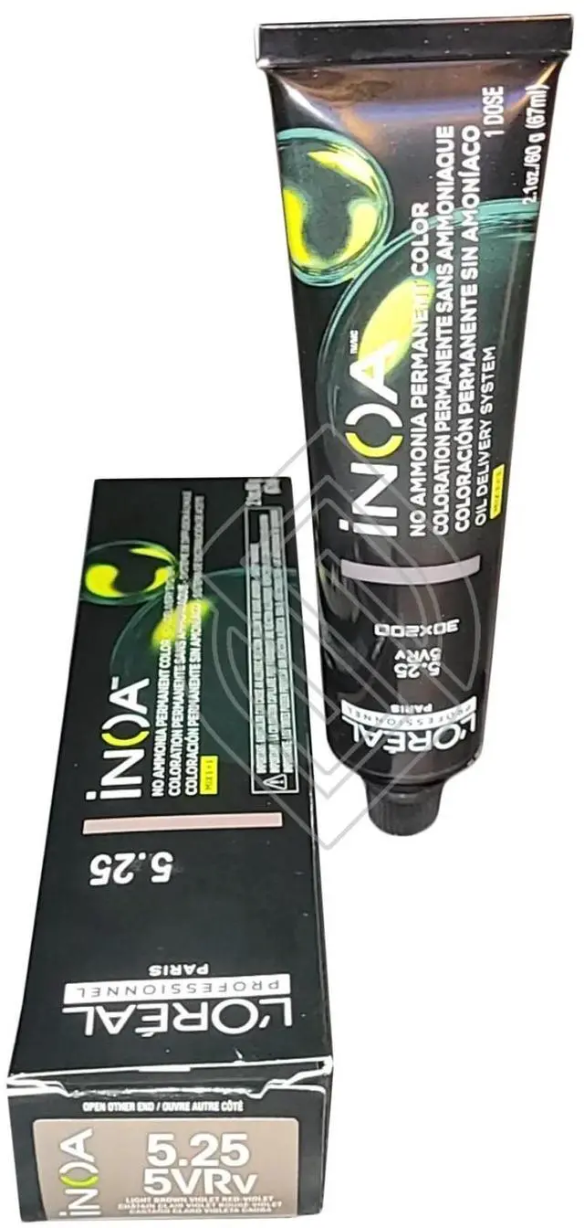 Loreal Professionnel Paris Inoa 5.25 /5VRv Light Brown Violet Red-Violet No Ammonia Permanent Hair Color 2.1 Ounce 60 Gram The no ammonia permanent color with ODS2 technology for uncompromised comfort. Lightens up to 3 levels in 35 minutes. Covers up to 100% of white hair. Easy to mix and apply. Leaves hair feeling intensely nourished and hydrated until the next color treatment. Hair is softer than before the hair coloring process. Sublime shine. Mix 1 to 1 ratio.