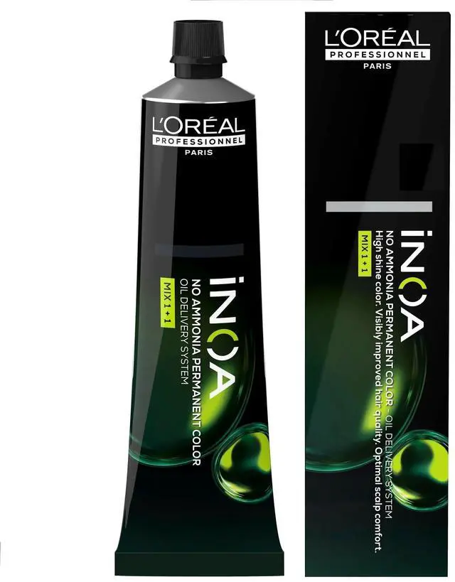 LOreal Professionnel INOA Ammonia Free Hair Color Permanent color withtechnology for uncompromised comfort. Lightens up to 3 levels in 35 minutes. Covers up to 100% of white hair. Easy to mix and apply. Leaves hair feeling intensely nourished and hydrated until the next color treatment. Hair is softer than before the hair coloring process. Sublime shine. Mix 1 to 1 ratio. Contains no ammonia and no odor.