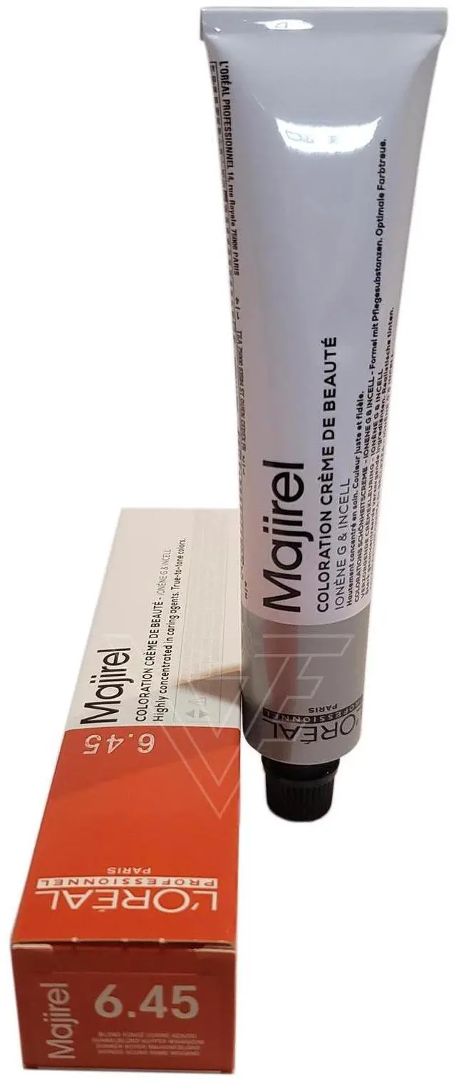 Loreal Majirel# 6.45 (Originally- 6.45 /6CRv) Dark Blonde Copper Mahogany Ionene G Incell Hair Color 1.7 Ounce 50 Gram This is a permanent color with Ionene technology for uncompromised comfort. Lightens up to 4 levels in 35 minutes. Covers up to 100% of white hair. Easy to mix and apply. Leaves hair with sublime shine feeling intensely nourished and hydrated until the next color treatment. Loreal Majirel makes hair softer than before the coloring process. Mix 1 to 1.5 ratio.