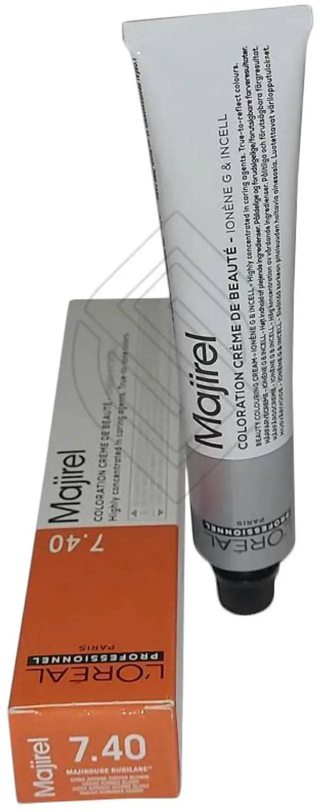 Loreal Majirel Hair Color Ionene G Incell # 7.40 (Originally- 7.40 /7CCC) Extra Copper Blonde This is a permanent color with Ionene technology for uncompromised comfort. Lightens up to 4 levels in 35 minutes. Covers up to 100% of white hair. Easy to mix and apply. Leaves hair with sublime shine feeling intensely nourished and hydrated until the next color treatment. Loreal Majirel makes hair softer than before the coloring process. Mix 1 to 1.5 ratio.