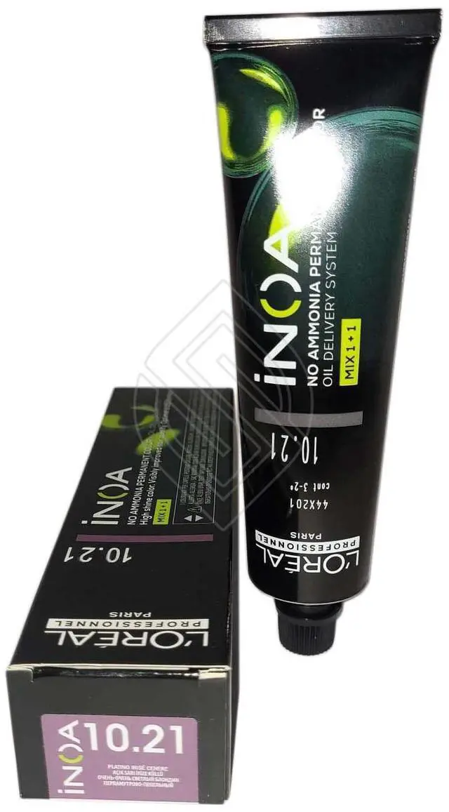 Loreal Inoa Ammonia Free ODS2 Hair Color 60g/2oz Lightest Iridescent Ash Blonde # 10.21 (Originally- 10.21 /10VB) permanent color with ODS2 technology with uncompromised comfort. Lightens up to 3 levels in 35 minutes. Covers up to 100% of white hair. Loreal Inoa hair color contains no ammonia and is enriched with oils and delivers outstanding color to the heart of the hair. INOA leaves hair feeling conditioned with sublime color radiance until your next color appointment. Experience our ultimate in luxury color, with improved comfort during the development time and no odor.