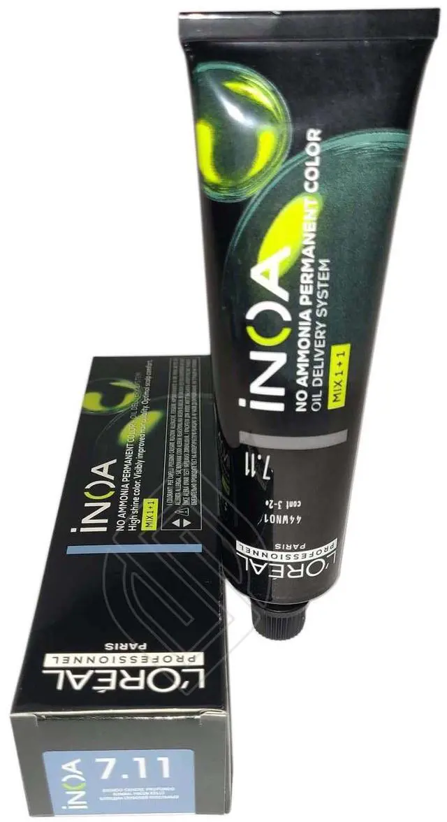 Loreal Inoa Hair Color # 7.11 (Originally- 7.11 /7BB) Deep Ash Blonde ODS2 No Ammonia 2 permanent color with ODS2 technology with uncompromised comfort. Lightens up to 3 levels in 35 minutes. Covers up to 100% of white hair. Loreal Inoa hair color contains no ammonia and is enriched with oils and delivers outstanding color to the heart of the hair. INOA leaves hair feeling conditioned with sublime color radiance until your next color appointment. Experience our ultimate in luxury color, with improved comfort during the development time and no odor.