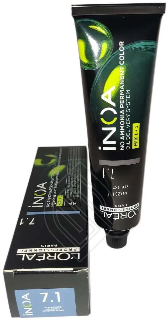 Loreal Inoa Ammonia Free ODS2 Hair Color 60g/2oz # 7.1 (Originally- 7.1 /7B) Ash Blonde permanent color with ODS2 technology with uncompromised comfort. Lightens up to 3 levels in 35 minutes. Covers up to 100% of white hair. Loreal Inoa hair color contains no ammonia and is enriched with oils and delivers outstanding color to the heart of the hair. INOA leaves hair feeling conditioned with sublime color radiance until your next color appointment. Experience our ultimate in luxury color, with improved comfort during the development time and no odor.