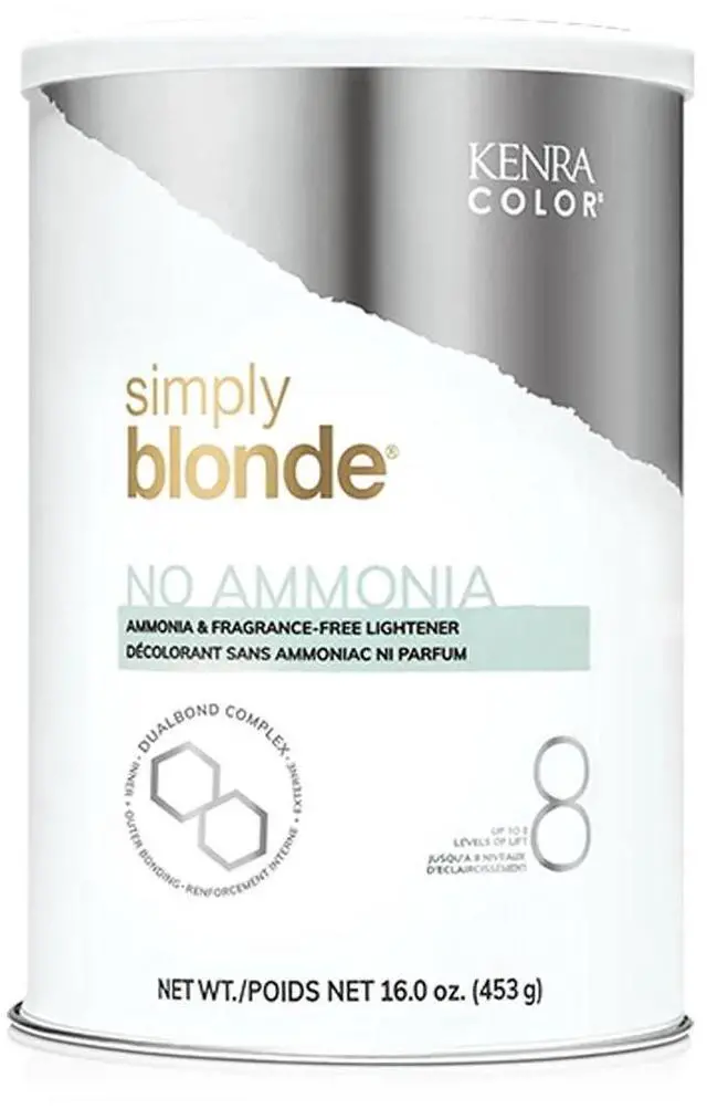 Kenra Simply Blonde No Ammonia Ammonia Fragrance-Free Lightener Up To 8 Levels Of Lift. Blonding you can trust. Creamy mixture that is drip free and flake free. De-dusted powder