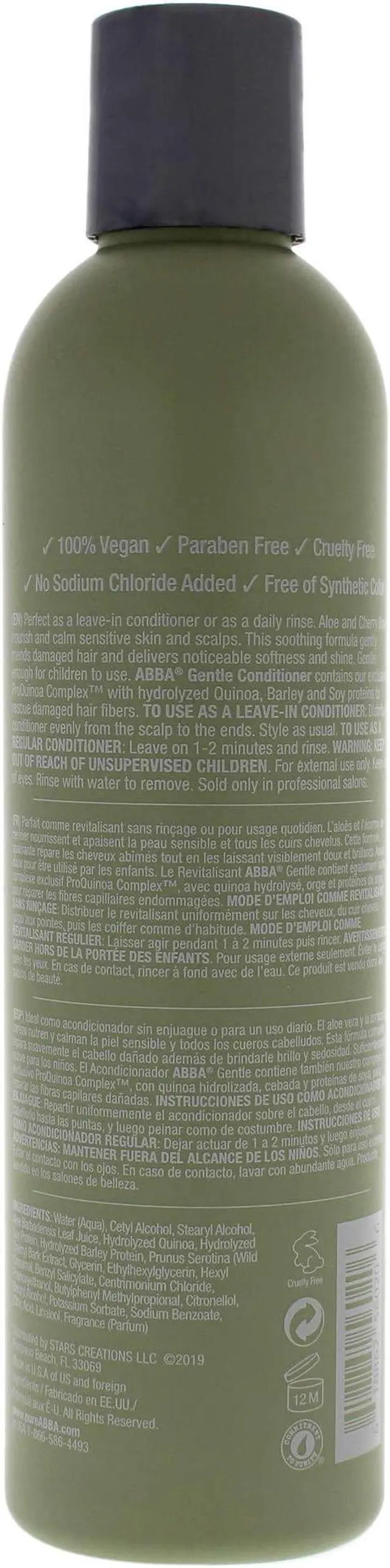 Abba Gentle Conditioner8oz 236ml is perfect as a leave-in conditioner or as a daily rinse. Aloe and Cherry Bark nourish and calm sensitive skin and scalps. This soothing formula gently mends damaged hair and delivers noticeable softness and shine. Gentle enough for children to use. For best results distribute the conditioner evenly from scalp to ends. Rinse with warm water. For maximum results, shampoo first using ABBA Gentle Shampoo.