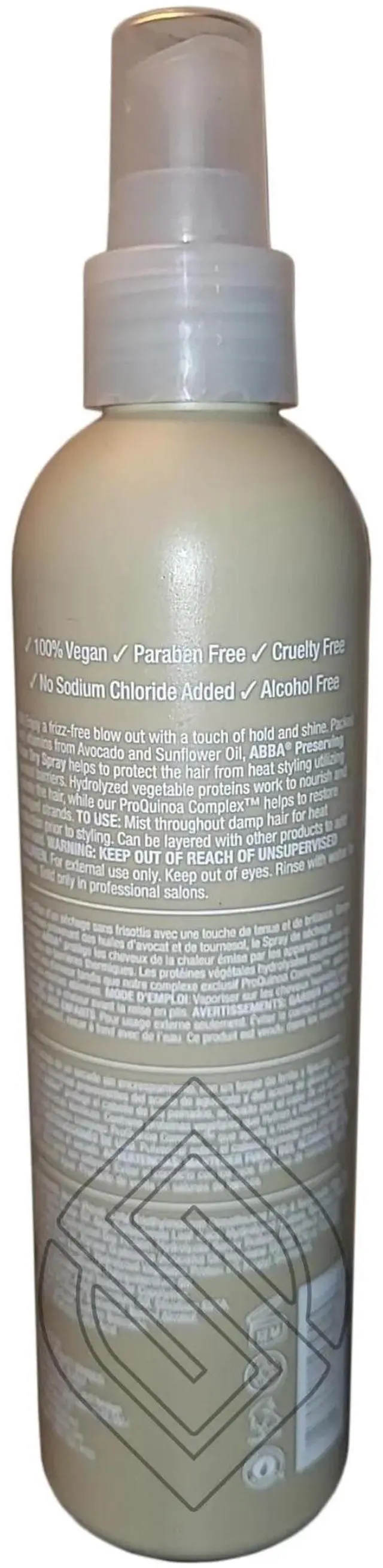 Abba Preserving Blow Dry Spray 8 Ounce 236 Milliliters protects the hair from heat styling with thermal and UV barriers. Hydrolyzed vegetable proteins work to nourish and hydrate the hair, while ourProQuinoa Complexhelps to restore damaged strands. Enjoy a frizz-free blowout with a touch of hold and shine. Packed with vitamins from Avocado and Sunflower Oil.