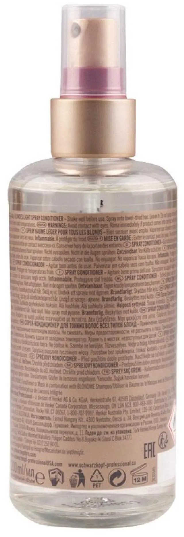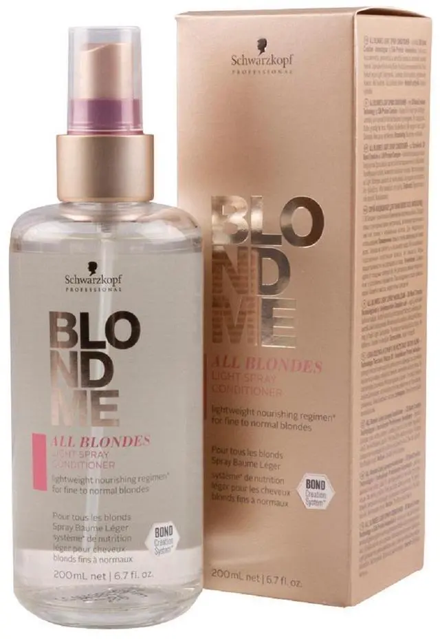 The BLONDME All Blondes Light Spray Conditioner, with 3D Bond Creation System and Silk Protein Complex, helps to build new bonds, while instantly detangling and softening fine to normal blonde hair types.