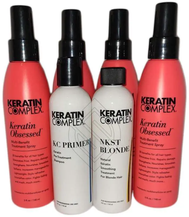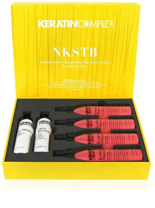 Keratin Complex NKSTB Natural Keratin Smoothing System For Blonde Hair Pre-Treatment Shampoo NKST Treatment Spray 4oz-Kit 28 Ounce 828 Millilitersis a reparative keratin treatment that reduces frizz and curl, activates at a lower heat temperature and is specially formulated for blonde, fine, fragile or overprocessed hair. Featuring a soft, neutral tint formula, NKSTB will not compromise the clarity of blonde, gray and silver tones and contains special conditioning to soften and protect fragile hair. Results last up to 5 months.