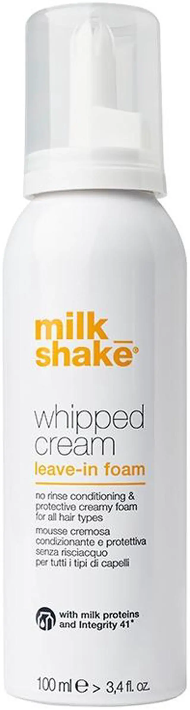 milk_shake whipped cream is a no-rinse conditioning and protective creamy foam for all hair types. This leave-in formula contains milk protein to condition and restructure hair, while providing softness and manageability without weighing it down. Integrity 41® helps to maintain hair color.