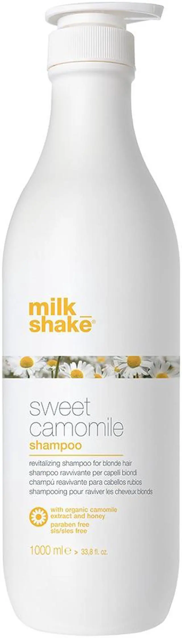 milk shake sweet camomile shampoo is a delicate, SLES-free revitalizing shampoo for blonde hair. Specifically formulated to revive highlights and enhance the brilliance and vibrancy of blonde hair. The camomile extract and organic honey in its formula act to soften hair and revive blonde highlights. Suitable for frequent use and also recommended for children.