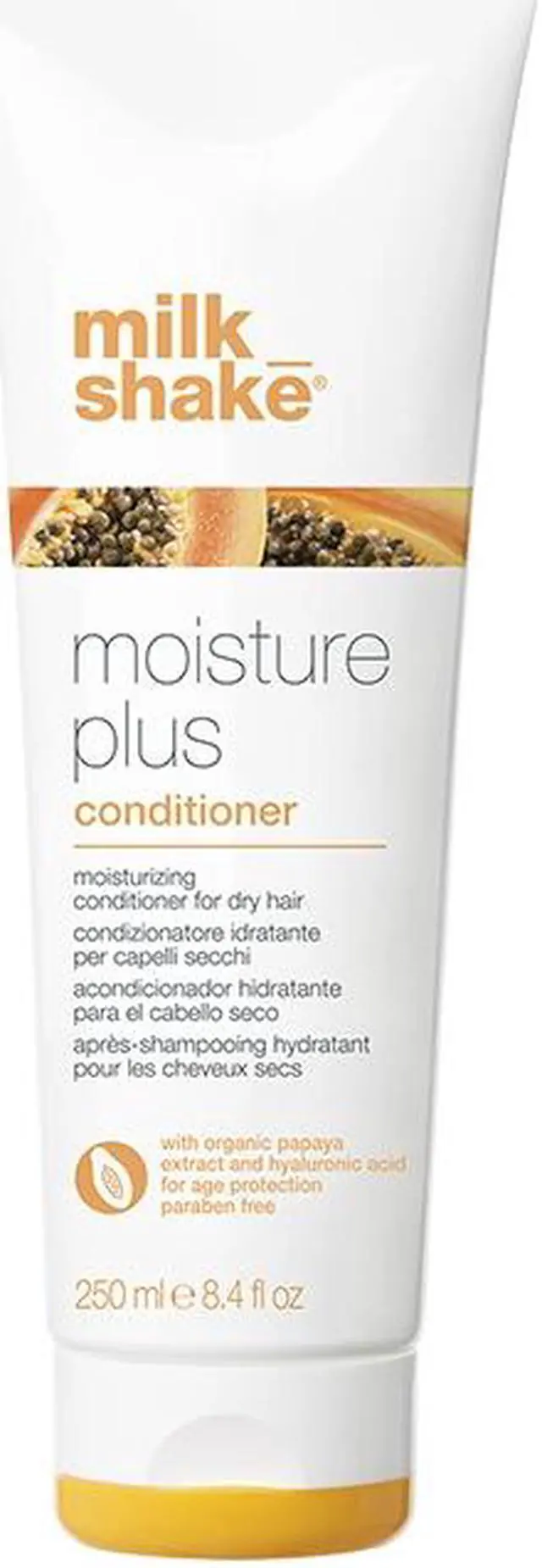 milk_shake moisture plus conditioner is a moisturizing conditioner for dry hair. It improves softness and manageability while maintaining optimal moisture balance. milk_shake moisture plus conditioner contains organic papaya extract, Integrity 41® and hyaluronic acid with anti-aging properties. Protects hair color from fading.