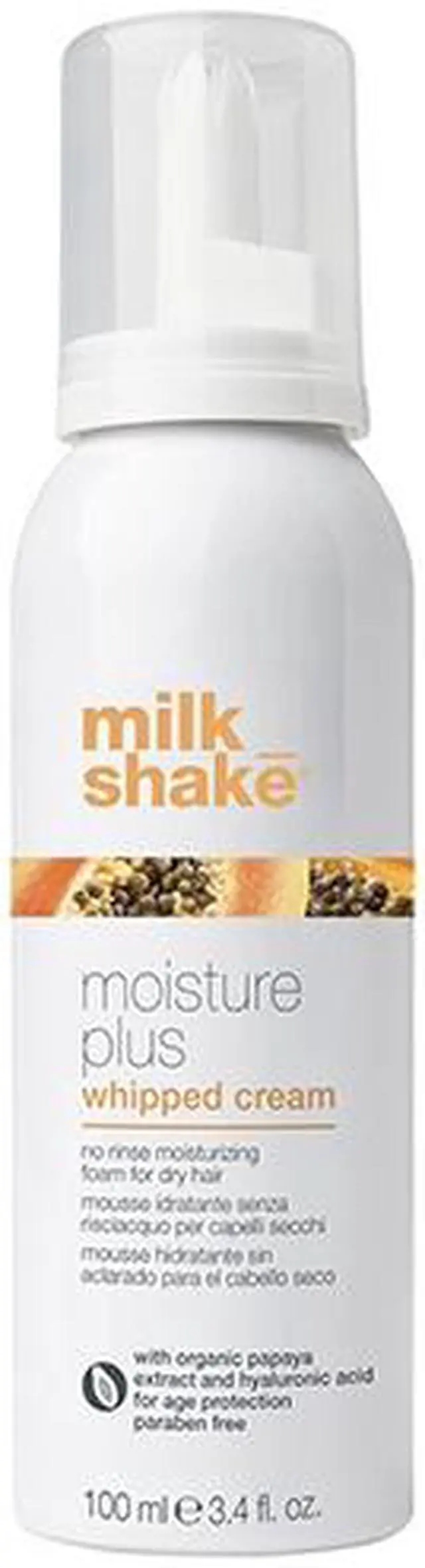 milk_shake moisture plus whipped cream is a no-rinse moisturizing foam for dry hair. It improves softness and manageability whilemaintaining optimal moisture balance. Leaves hair soft, shiny and healthy. milk_shakereg moisture plus whipped cream contains organic papaya extract, Integrity 41reg and hyaluronic acid with anti-aging properties. As well it protects hair color from fading.