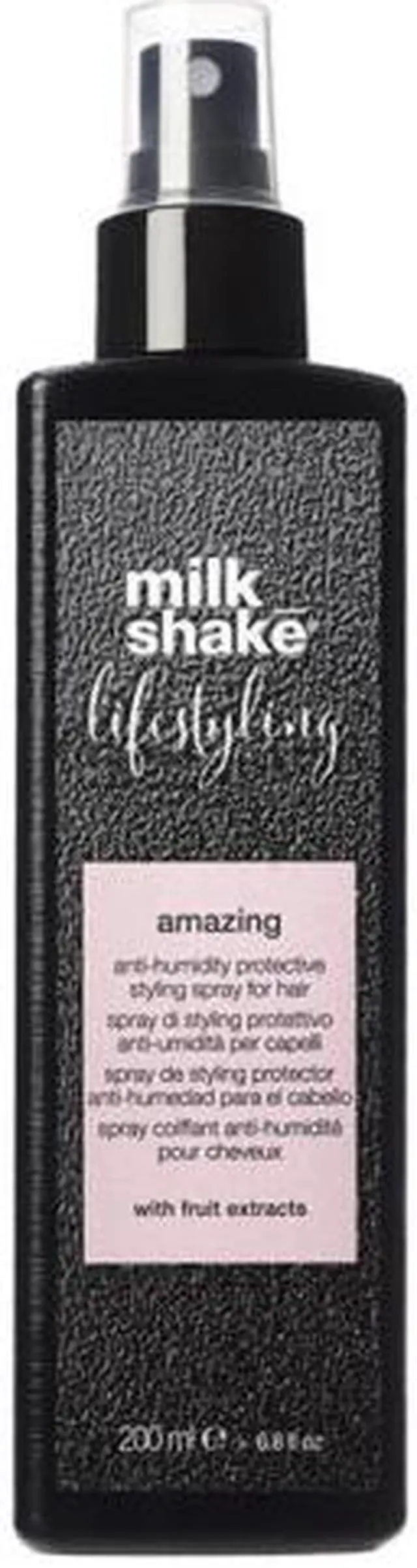 milk_shake® lifestyling amazing anti-humidity protective styling spray for hair is a pre-styling spray capable of eliminating frizz with a long-lasting result. The special polymers within its formula are heat-activated, creating a film-like effect over the hair that protects hair from humidity, protects hair color and maintains the hairstyle for longer. Its formula, enriched with fruit extracts, gives a shiny, glossy finish with a mirror-like effect. It reduces drying time, protects from heated styling tools, doesn’t leave residue and doesn’t weigh the hair down.