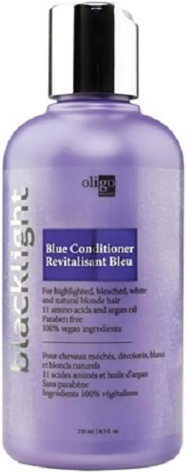 Oligo Blacklight Blue Shampoo and Conditioner together for highlighted, bleached, white and natural blonde hair, eliminates brassiness and refreshes faded highlights leaving hair looking cleaner and brighter.