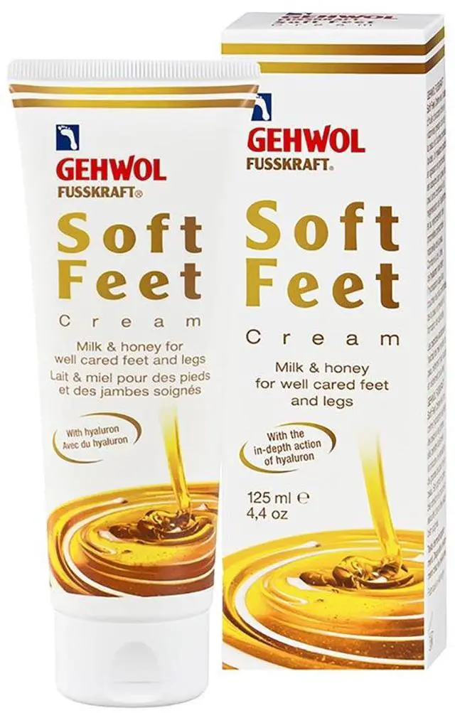Gehwol Fusskraft Gehwol Soft Feet Cream For Well Cared Feet And Legs 4.4 oz contains vitamin-rich avocado oil and other valuable lipids in a gently caring base. A special deep-acting Hyaluron is absorbed by the skin, supporting skin regeneration and strengthening the skin's own defenses. In combination with urea, Hyaluron also binds moisture in deeper skin layers and protects against callus formation. Milk peptides and honey extract render the skin noticeably more supple and visibly smoother. GEHWOL FUSSKRAFT Soft Feet Cream is a moisturizing foot and leg care product that is easily absorbed, leaving behind the feeling of silky soft skin.
