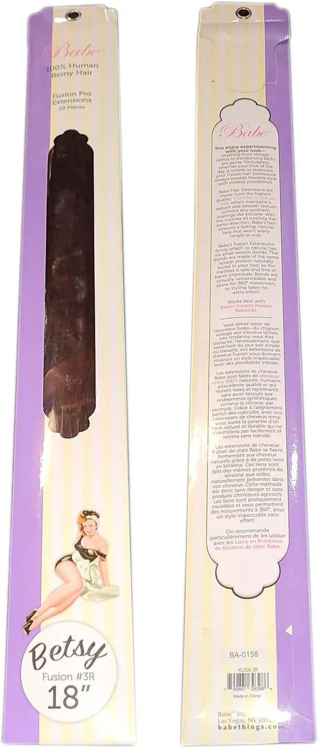 Babe Fusion 18 Inch #3R (Betsy) Hair Extensions Straight Colors 20 Pieces Ounce Gram Fusion Hair Extensions look and feel so natural since the extension strand is fused to hair using a keratin bond. Keratin is safe, hair-friendly, and durable. Your hair will have amazing 360-degree movement and youll have no fear of slippage. Fusion extensions are perfect for long-lasting use because they are made of 100% human Remy hair of the finest quality. Each strand comes pre-bonded and ready for use. For removing these extensions use Keratin Bond Remover that softens the bond.