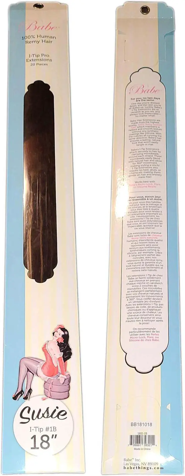 Babe I-Tip Pro 18 Inch #1B (Susie) Hair Extensions Straight Color 20 Pieces Ounce Gram These hair extension strands are easy to install. They offer the 360-degree movement of I-Tip Extensions. This helps to increase hairs volume, length, and versatility. This amazing method has absolutely no chemicals, no glue, and no heat. The beads are easy to hide and are available in 5 different colors. Microbeads are clamped to securely hold each hair extension strand in place. That means your hair can be long and full without the worry of slippage.