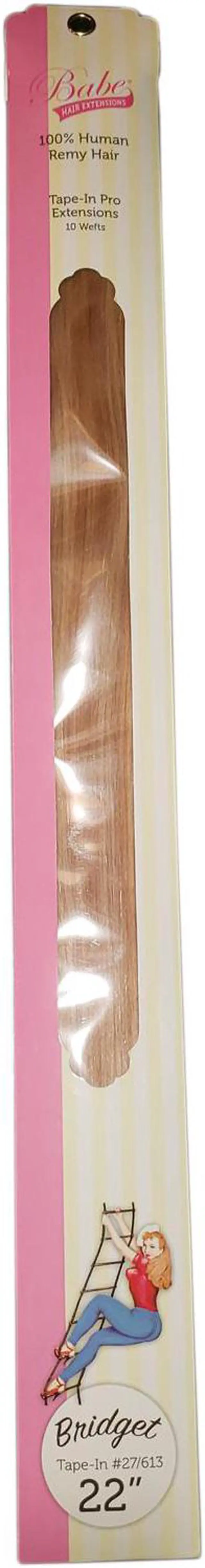 Babe Tape-In 22 Inch #27/613 (Bridget) Hair Extensions Straight Color 10 Wefts Ounce Gram This revolutionary method is astonishingly fast and the look is shamelessly seamless. It takes as little as 45 minutes to look fabulous. The medical grade adhesive is designed for hair, so with proper care, tape wont weaken until youre ready to remove it with the help of our trusty Tape-In Bond Remover. May be reused up to 3 times. Lasts 3 to 6 months with proper care. Available in 14 inch straight, 18 inch straight, and 22 inch straight.