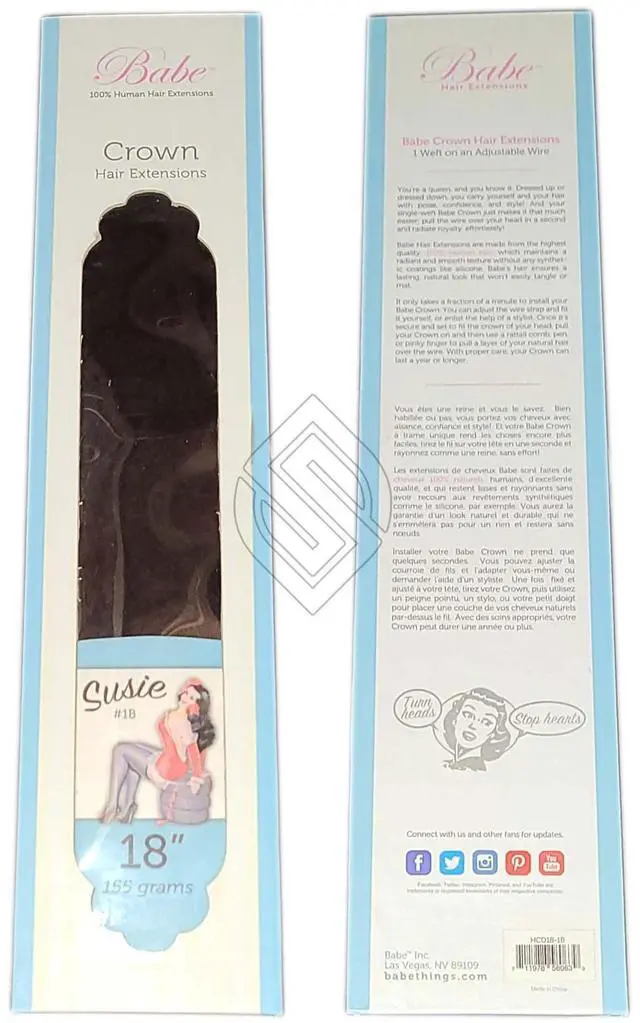 Babe 18"-155 Grams Susie #1B Crown Hair Extensions Ounce Gram Babe Instant hair crowns are easy to install 100% human, removable hair extensions. It just takes a minute to fix it. Adjust the wire strap and fit it in the hair. then use a tail comb or your fingers to pull natural hair over the wire to hide the extensions. These hair extensions can be styled just like normal hair/ Curl, straighten or perm as per your wish!